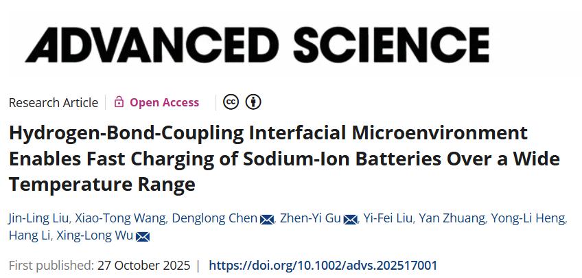 近期,我院化工新材料首席专家陈登龙教授在钠离子电池领域取得重要进展,其研究成果以“Hydrogen-Bond-Coupling Interfacial Microenvironment Enables Fast Charging of Sodium-Ion Batteries Over a Wide Temperature Range”为题,发表于国际知名学术期刊Advanced Science.