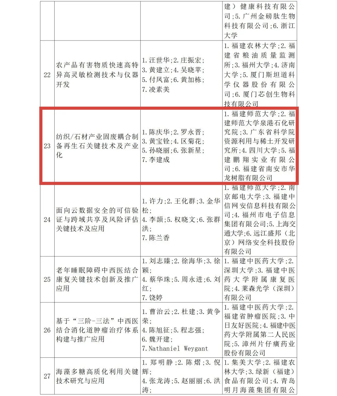 近日,福建省人民政府发布了关于2024年度科学技术奖励的决定。由福建师范大学原副校长、研究院首席科学家陈庆华教授作为第一完成人,研究院协同创新专家罗永晋教授作为第二完成人,研究院作为第二完成单位联合攻关的“纺织/石材产业固废耦合制备再生石关键技术及产业化”项目,荣获福建省科学技术进步奖二等奖。这是我院在服务地方产业绿色发展、推动产学研深度融合方面取得的又一重要成果。